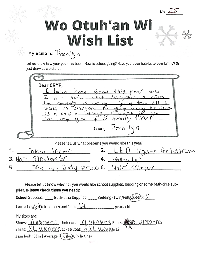 Please do not wrap the gifts. Our team here at the CRYP will make sure everything is beautifully wrapped and ready for family pickups. Please feel free to send wrapping paper, ribbons, and other gift-wrap supplies, if you wish! We would be grateful to have them.